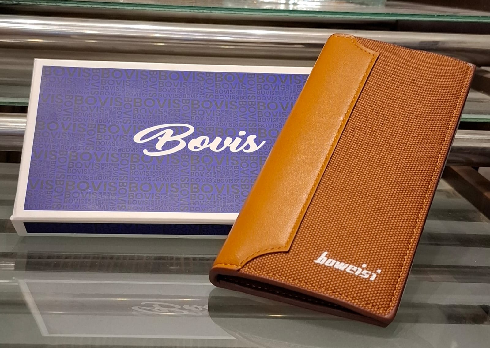 Elegant BOWIESI branded wallet with a stylish two-tone leather design.